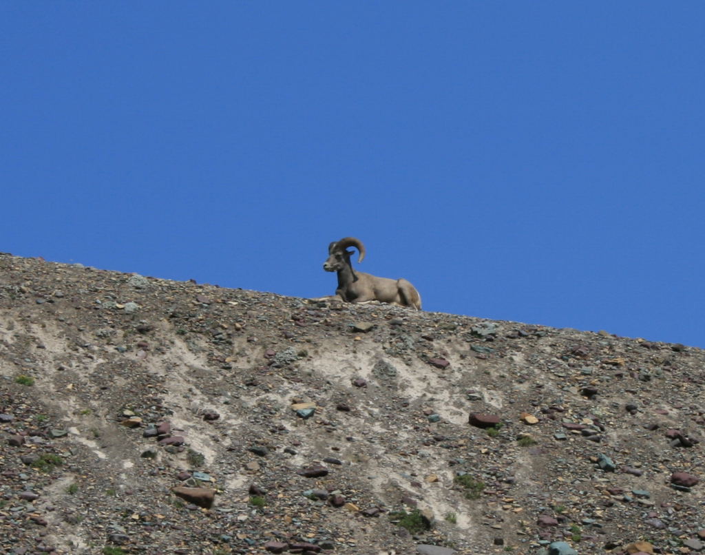 and rock features in every direction. Near the top of the trail you will see mountain goats, probably very close to the trail, but certainly up high on the crags, leaping impossibly from point to point or just hanging out. The last time we were there we also saw a single bighorn sheep at the top of a talus slope, hunkered down in the sun, king of all he surveyed.