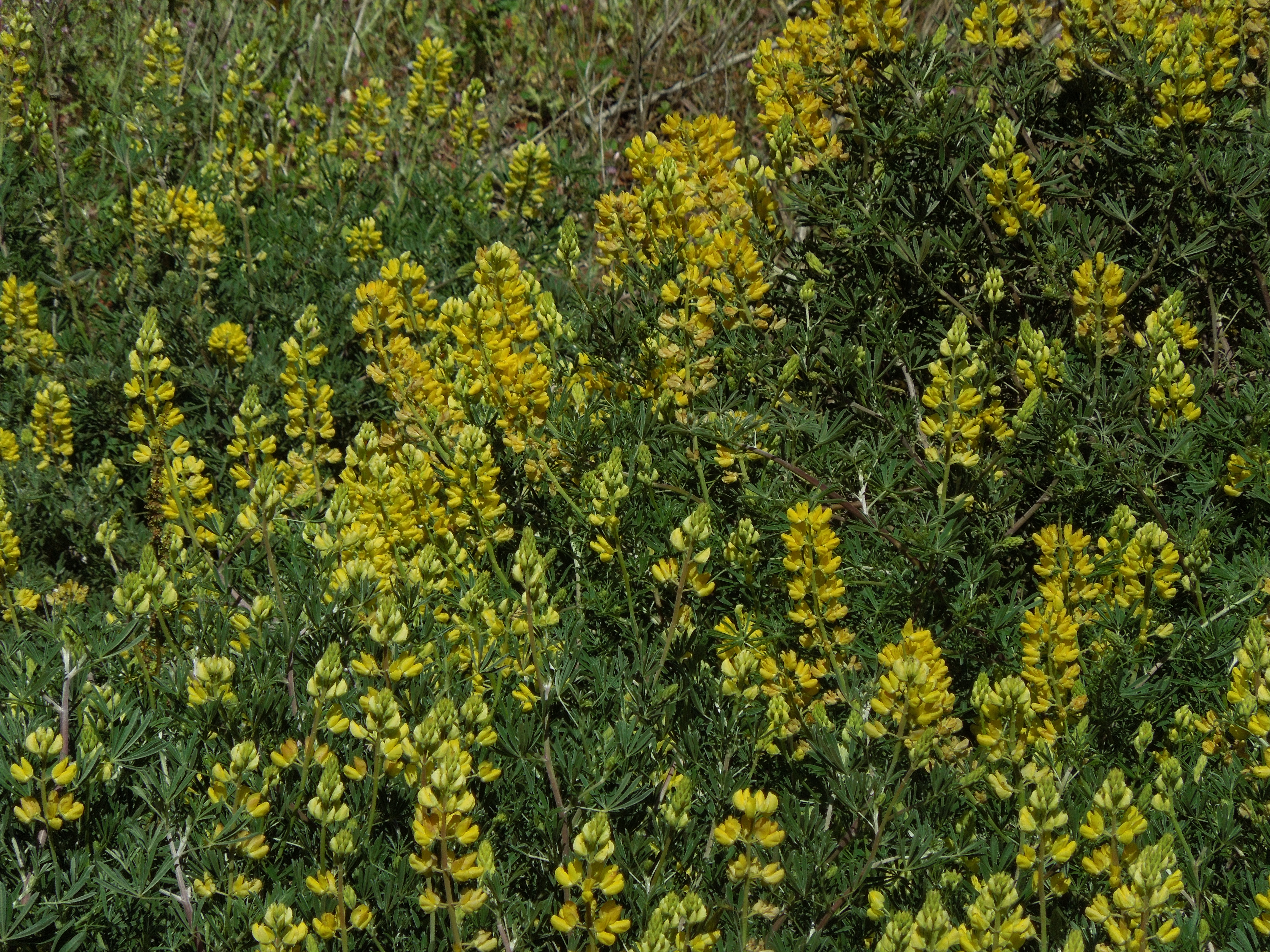 Mostly level or gently sloping, the trail did present a challenge to fitness and old knees in the form of a series of stair steps (more than 100) that climbed up and up through a eucalyptus grove, then out into the sun again and down, down the other side of the hill past yellow lupine and poppies.