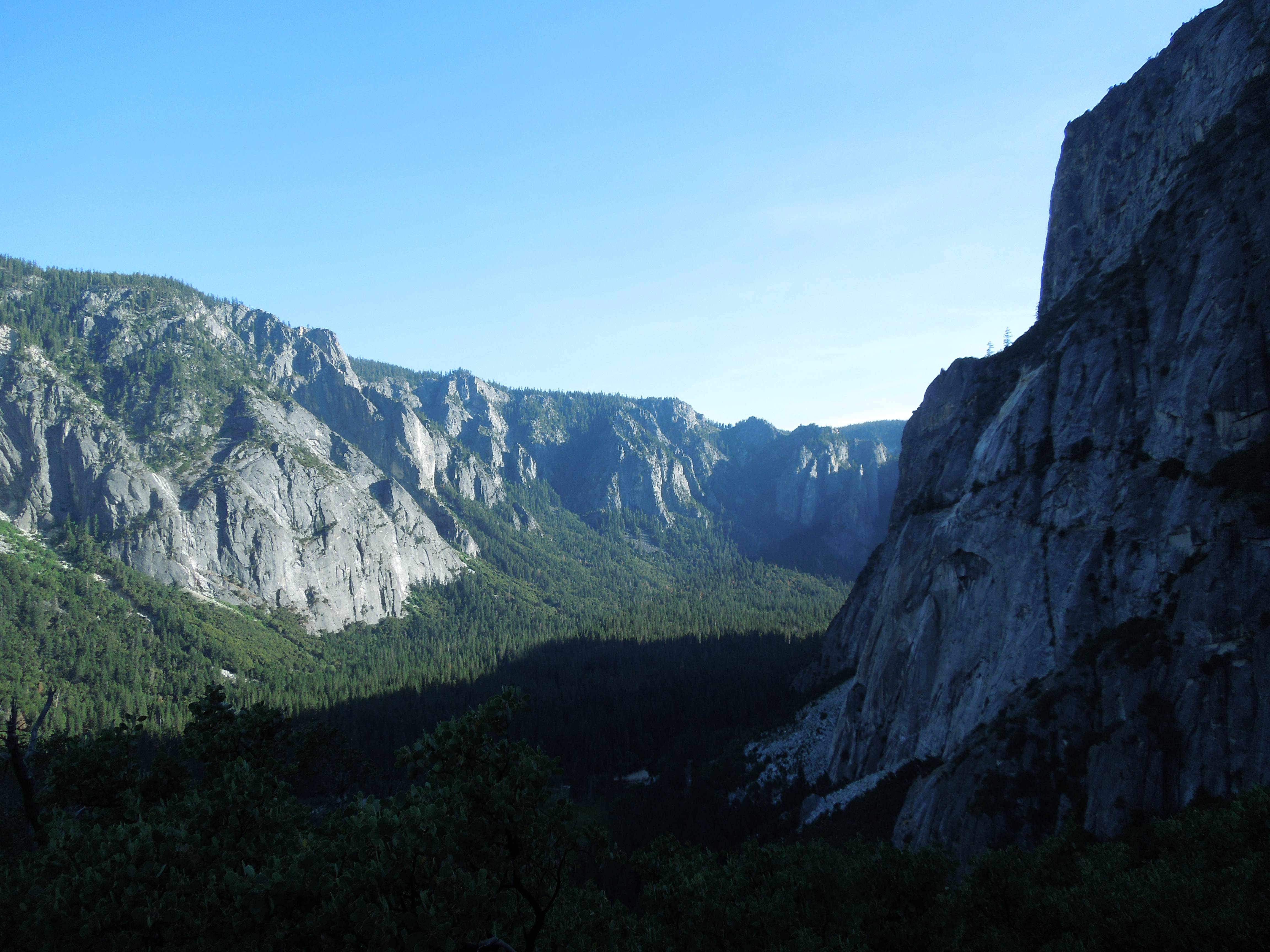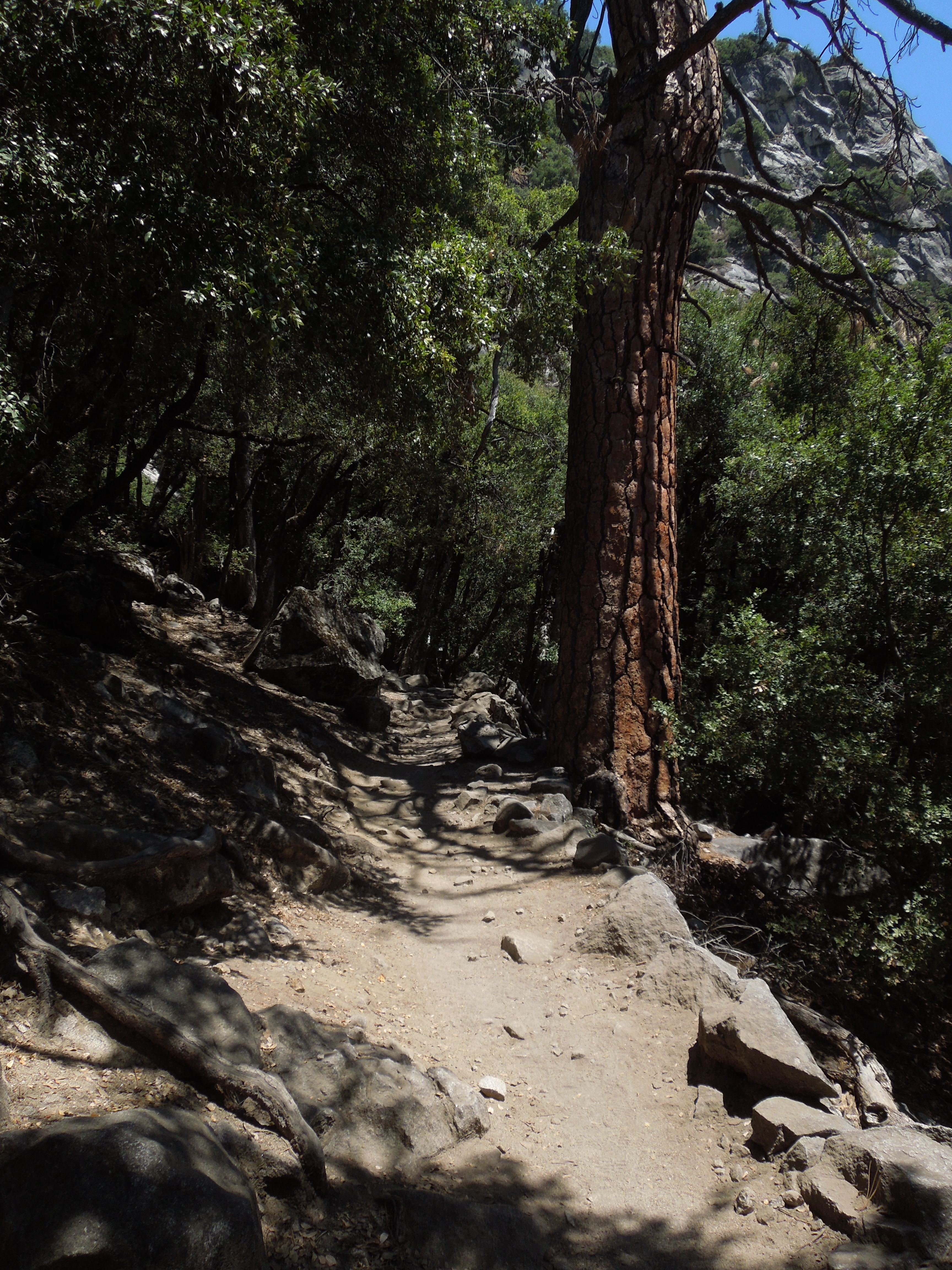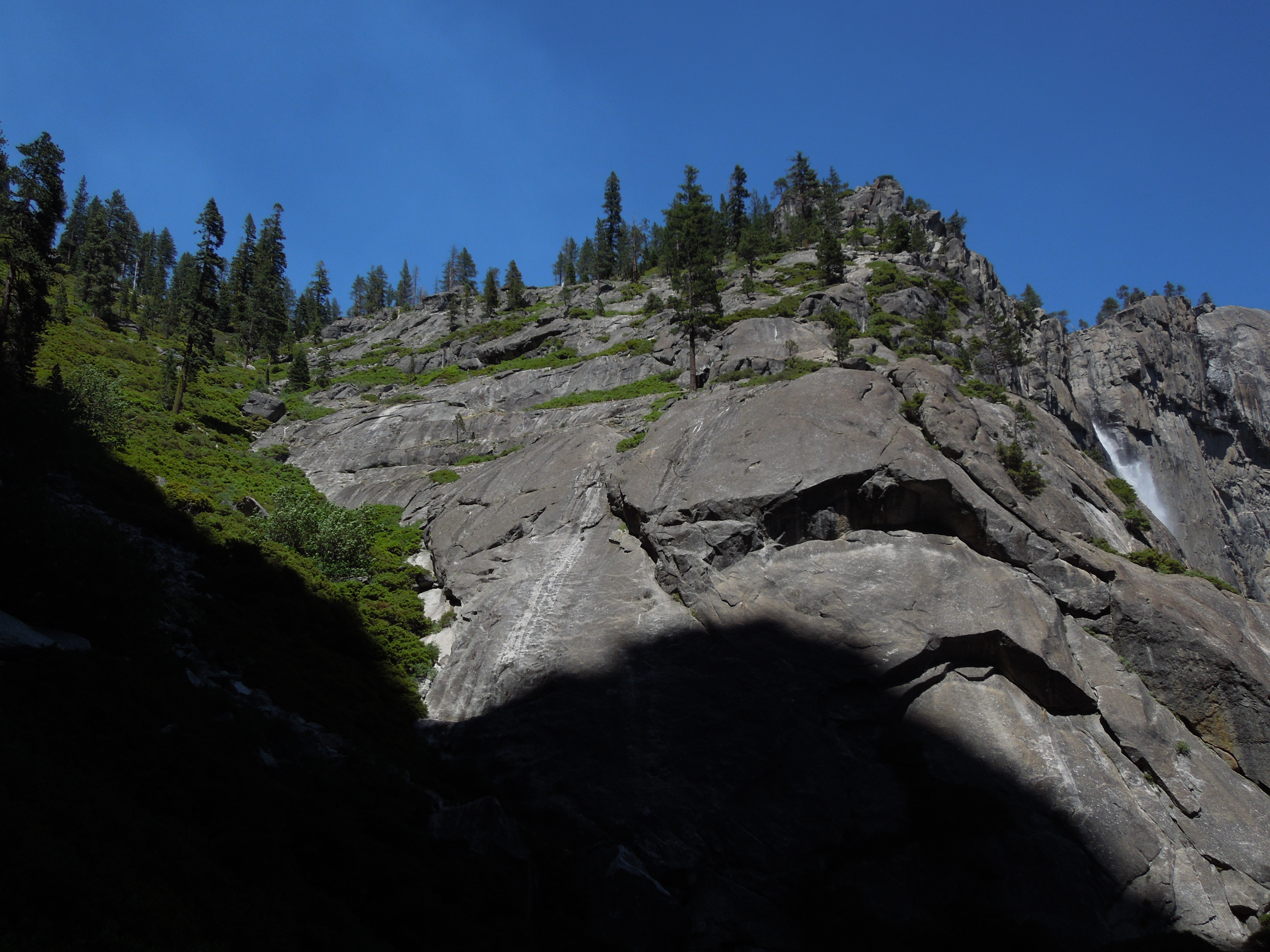 The trail ascends very steeply beyond Columbia Rock, and then . . . it starts to switchback downhill. This can’t be right, I’m thinking. We just killed ourselves to gain all that elevation, and now we’re descending? But the trail continues down and then almost levels out for a total of about a half mile, along its course yielding a full on view of upper Yosemite Fall.