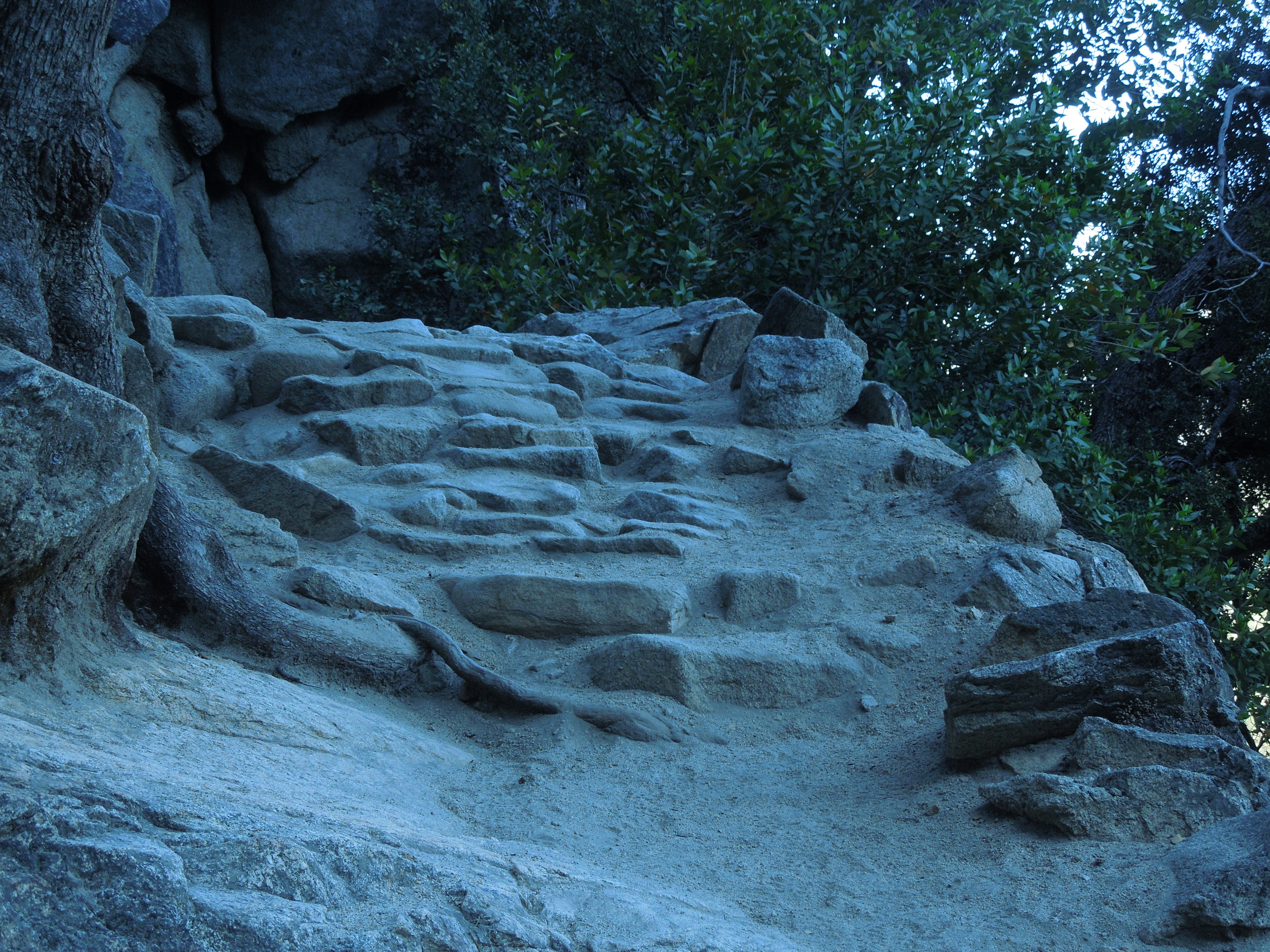 Most of the trees disappear as well, and the green along the switchbacking trail is predominantly manzanita scrub. We soon realize that our late start on the hike has an unforeseen benefit because the sun is already dropping behind the granite wall above this part of the trail. The shadows climb straight up faster than we traverse the switchbacks, so we avoid the sun’s direct heat on most of the last two relentless uphill miles of the trail.