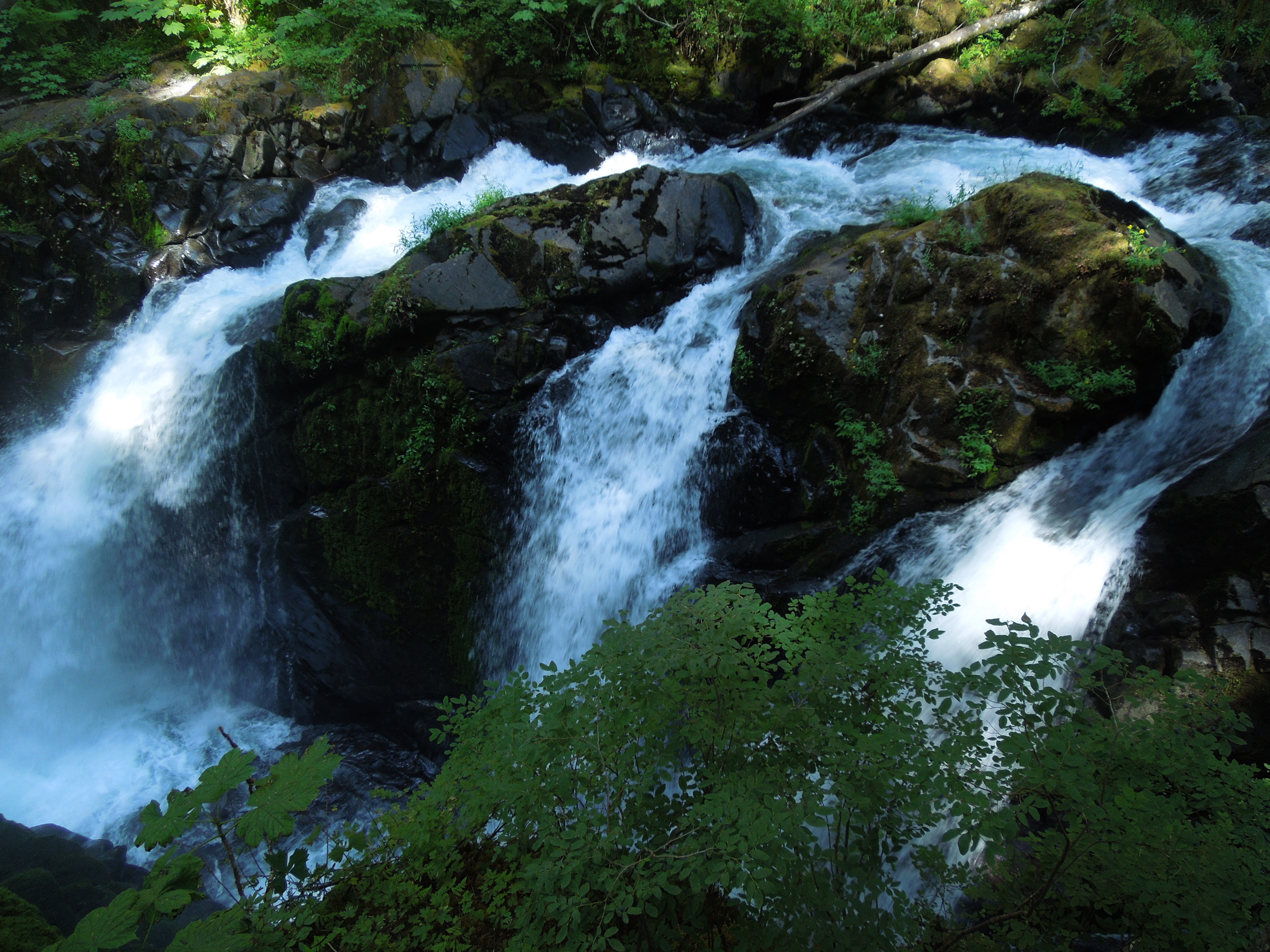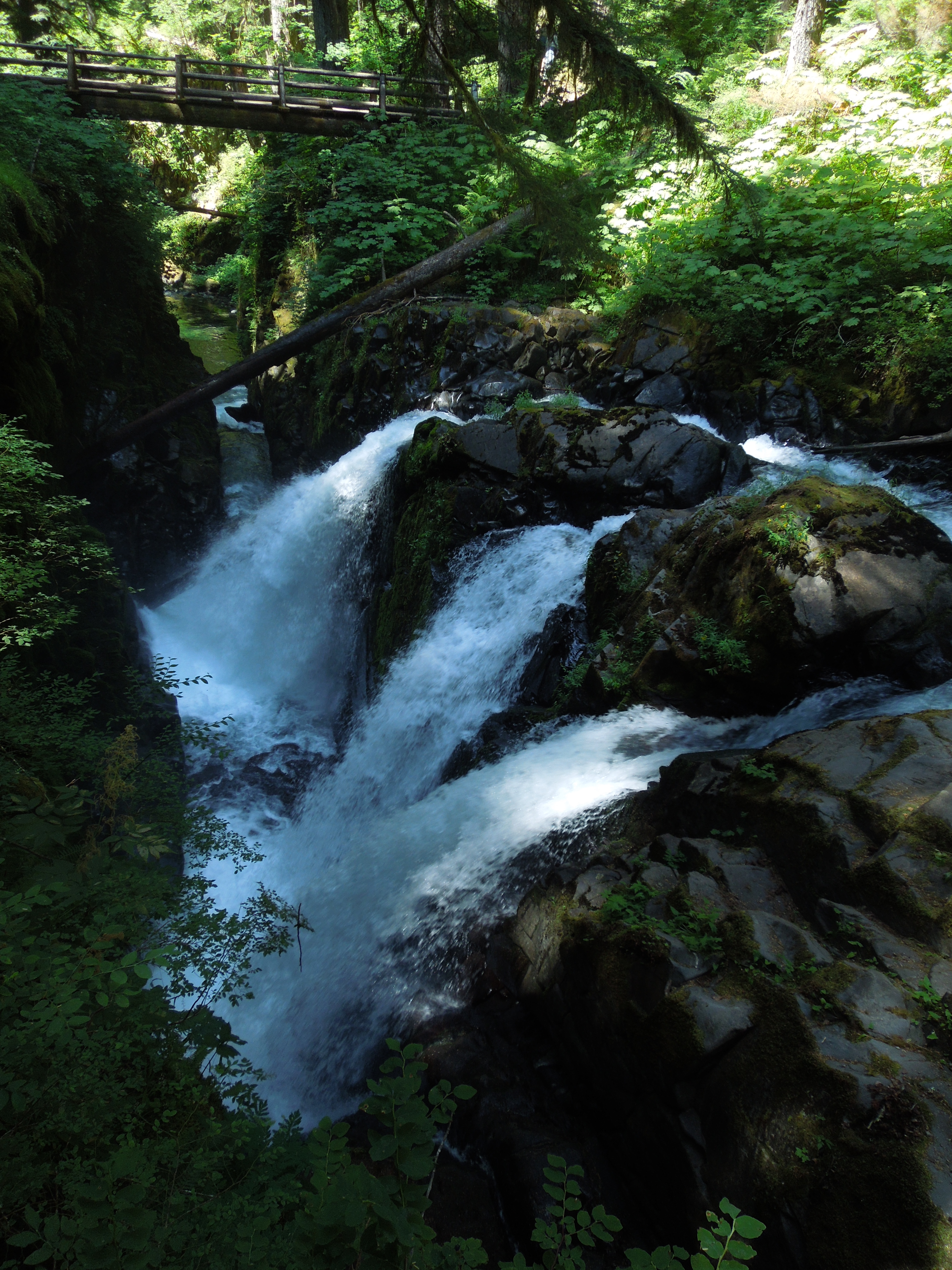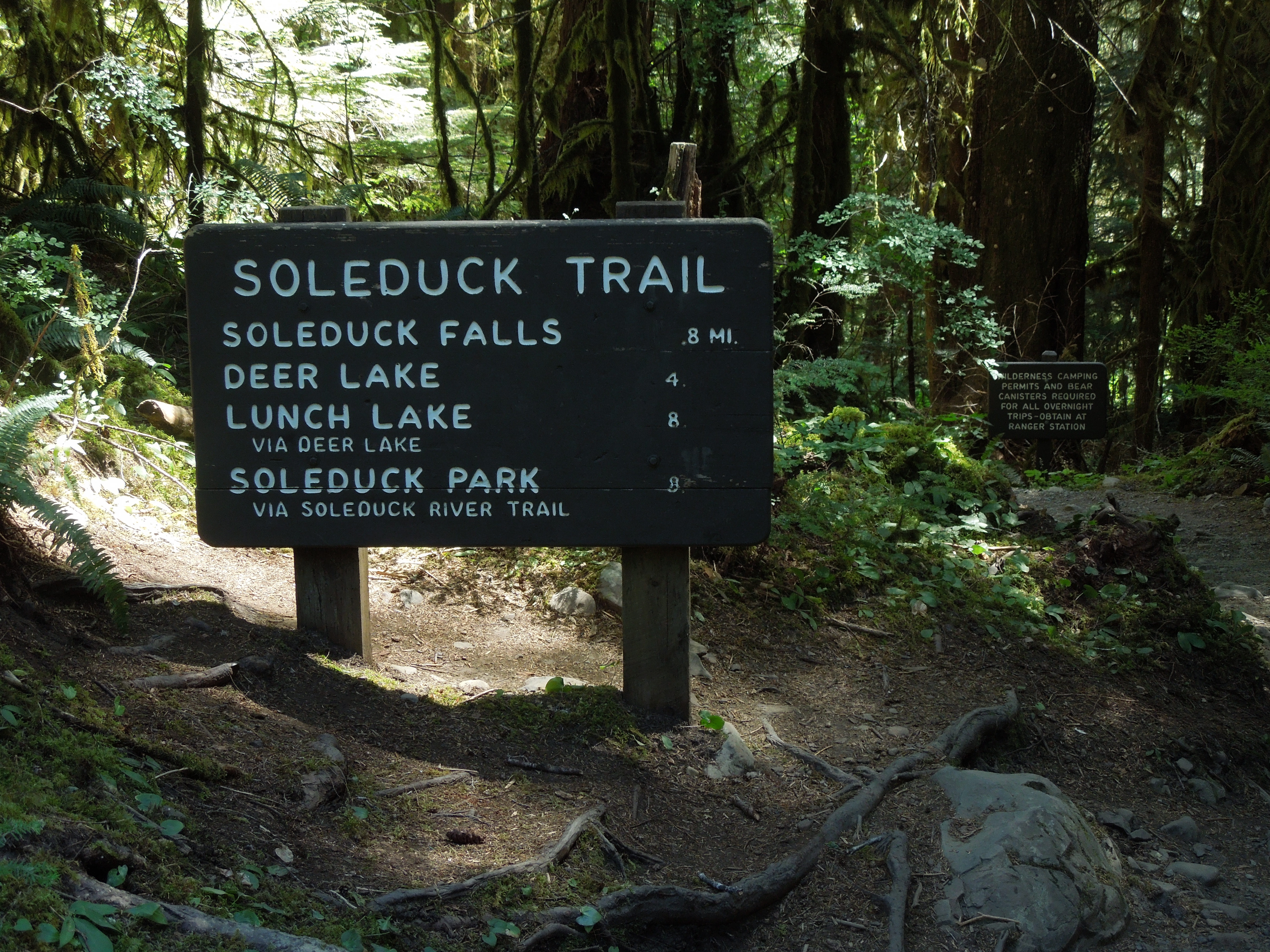 Before we visited Olympic National Park this summer, we decided we wanted to hike to Sol Duc Falls because of photos we had seen of its unusual structure. As we drove into that part of the Park off Highway 101 to find the trailhead, we were still unsure of how to pronounce the name of the Falls, and several options seemed possible. We must not have been the only visitors who wondered, but we wondered no more once we saw the signs.