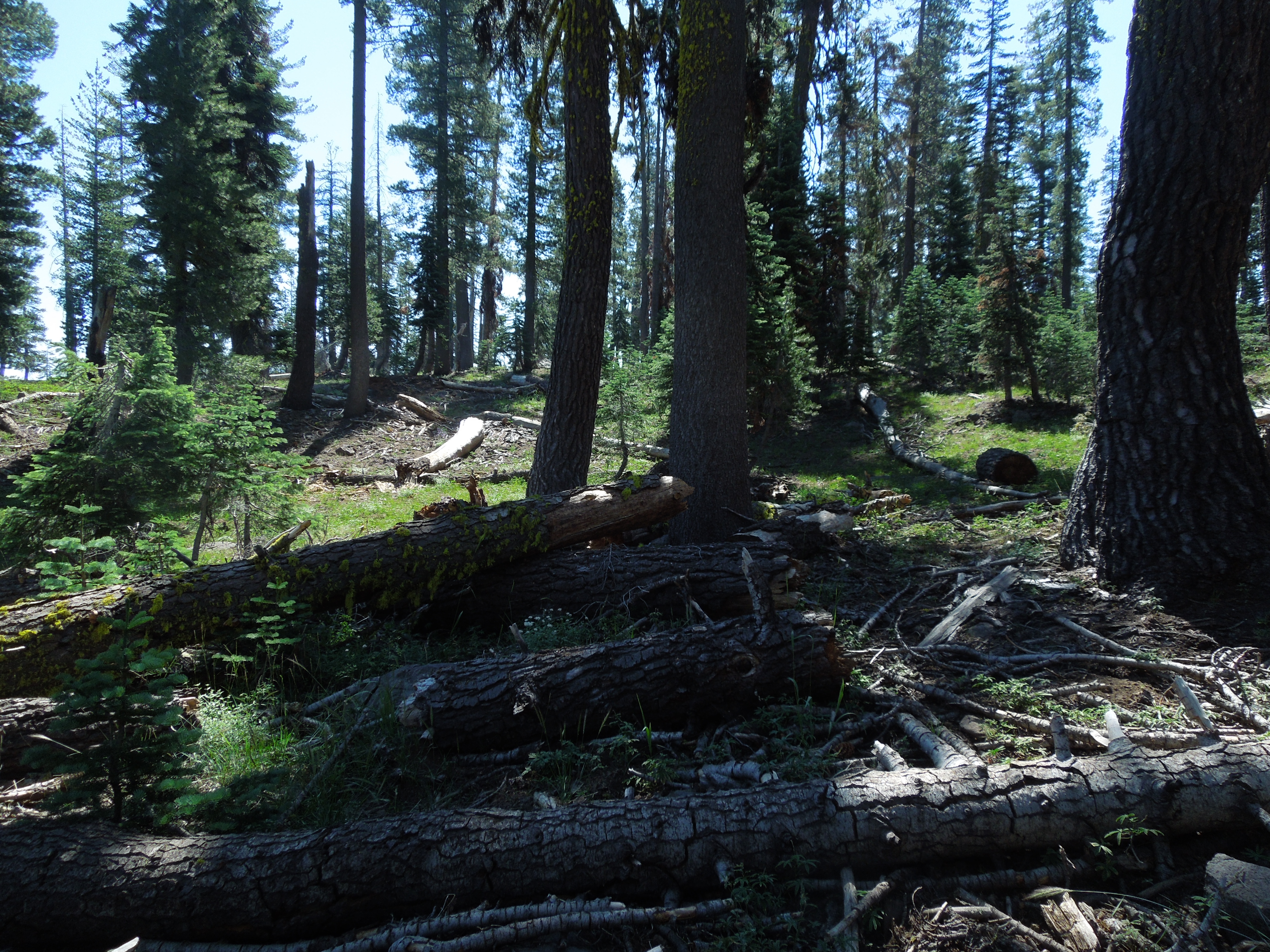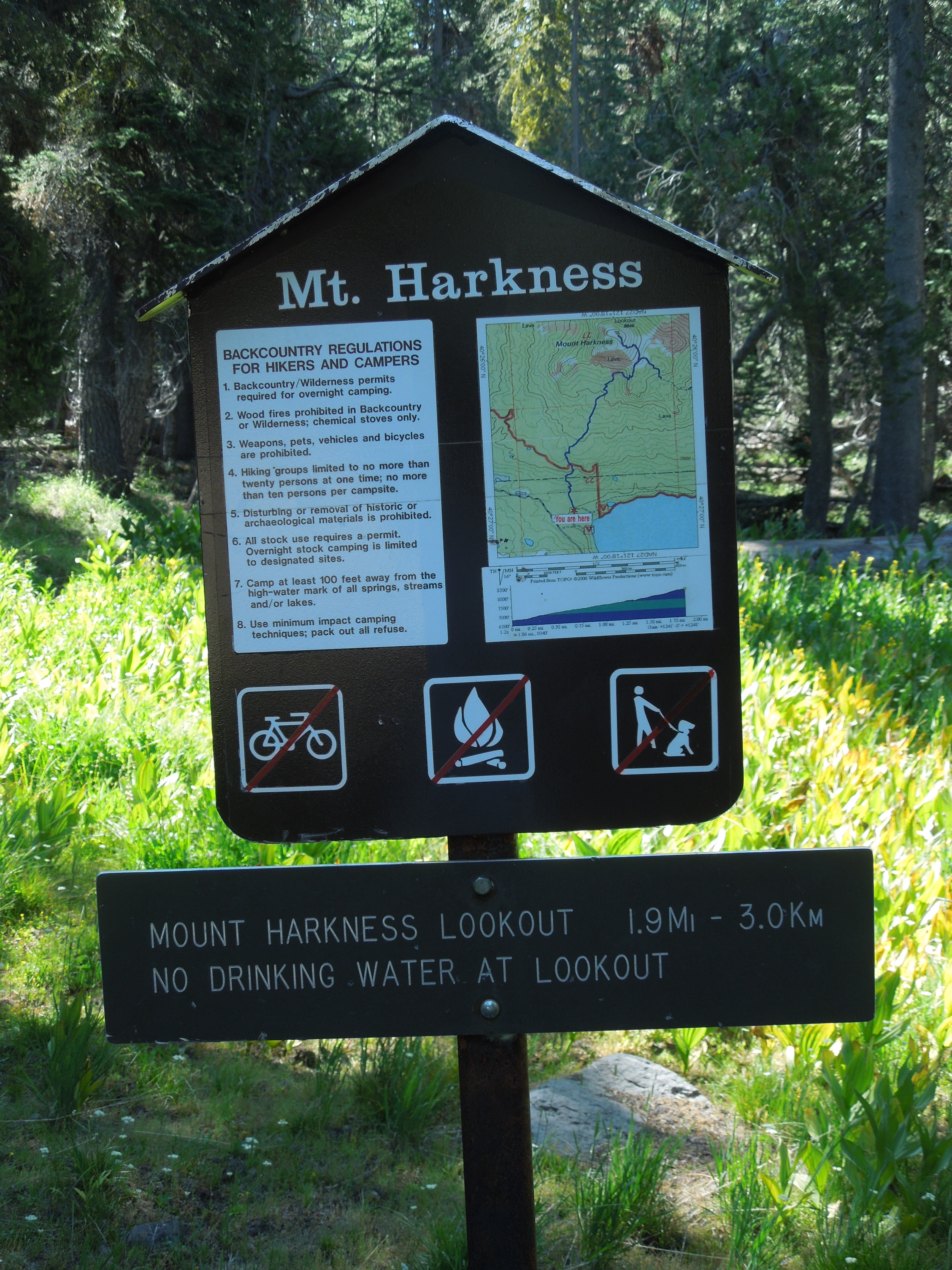 The trailhead for the hike to the top of Mt. Harkness is in the Juniper Lake campground, 13 miles from the town of Chester on a mostly unpaved road, rough and teeth-rattling. There is day use parking above the campground. The trail starts up gradually through meadow and forest, then climbs more steeply through an old forest with lots of snags and downed trees.