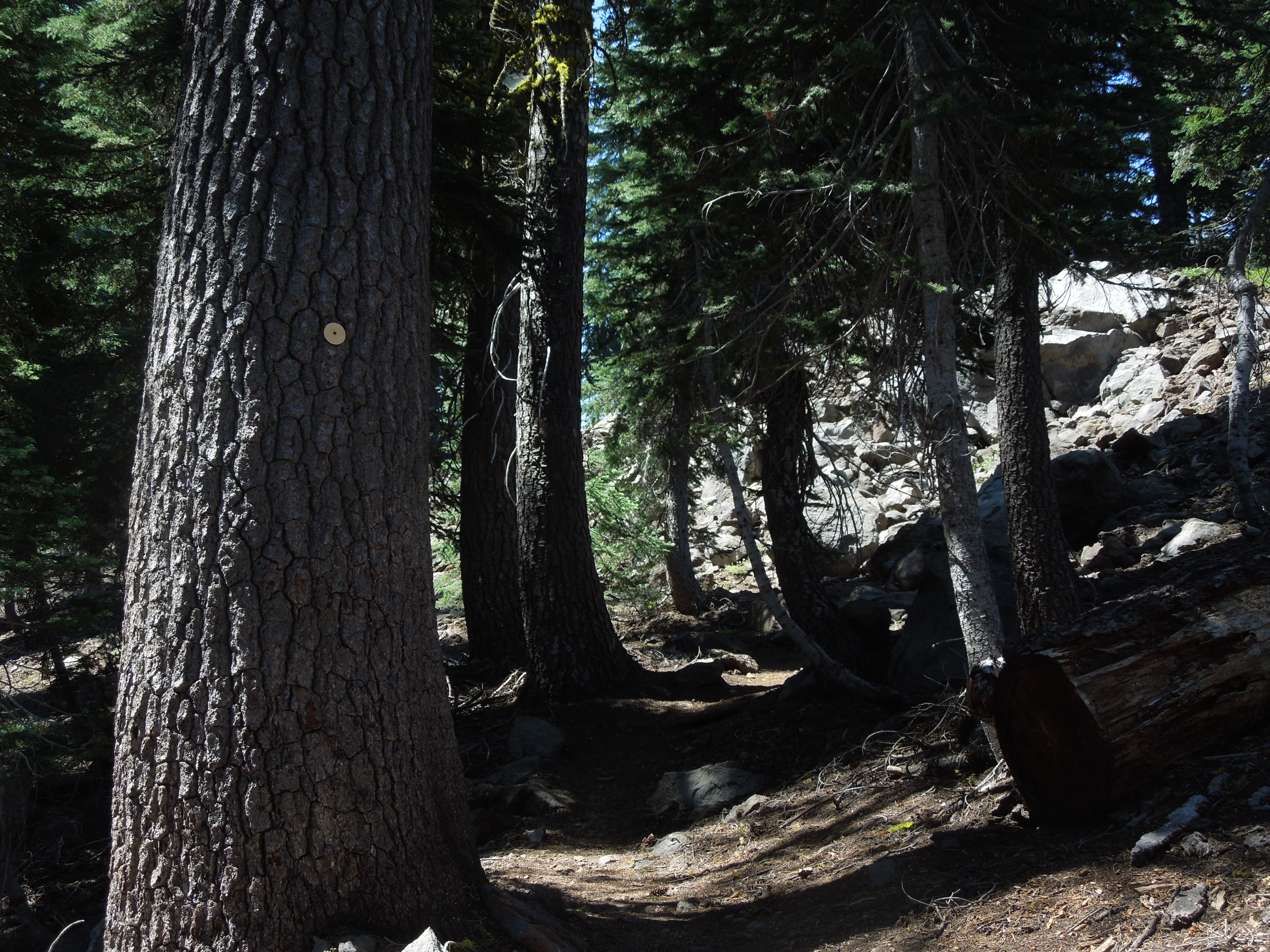 Soon Juniper Lake will be visible below, and as you continue up and begin to skirt the flanks of Mt. Harkness, you alternate being out in the open and in the trees. Occasionally, it is unclear where the trail goes, and the metal disk blazes on tree trunks will keep you on track.