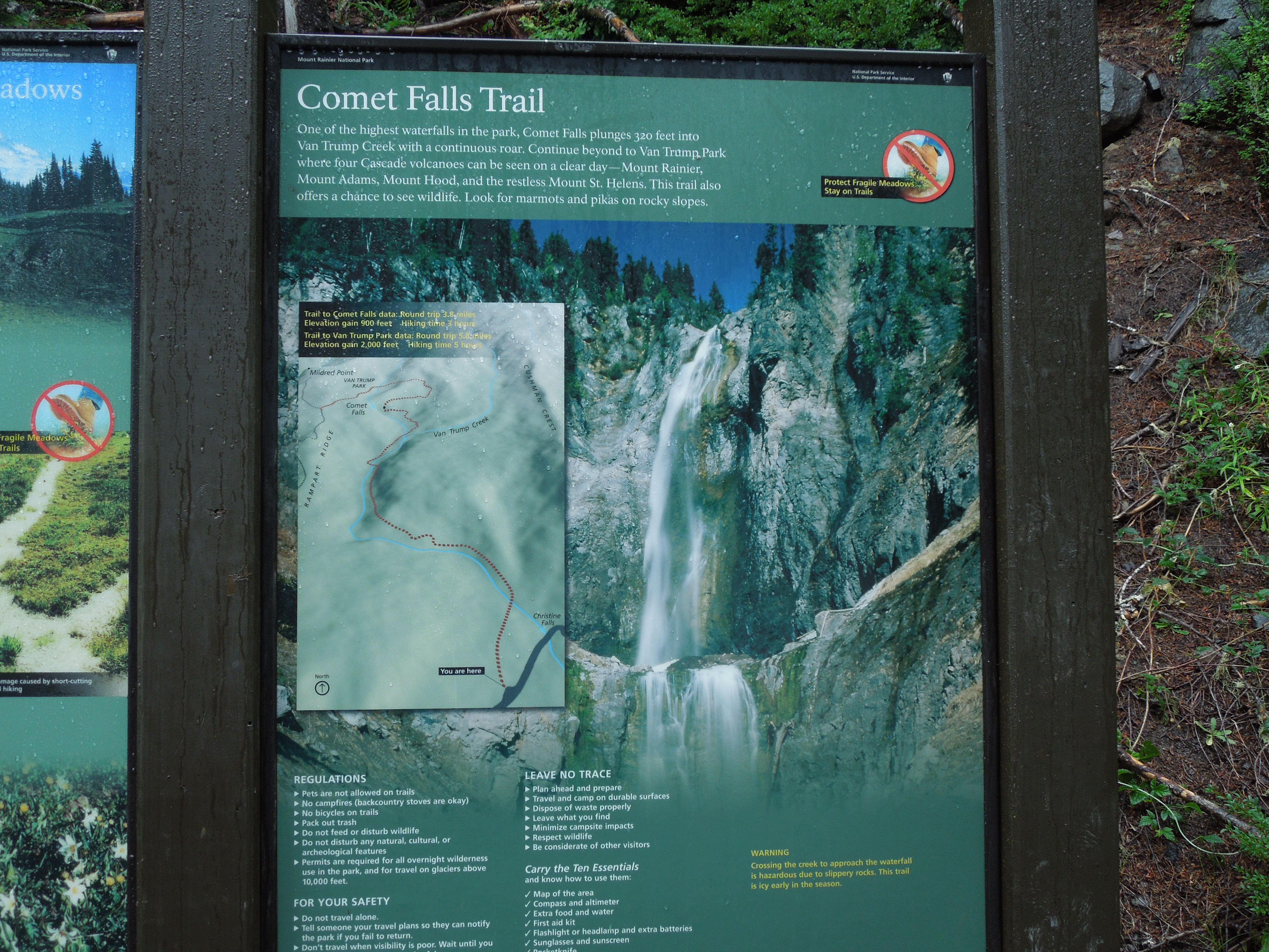 The Park Rangers were right that taking this hike was worth our time. It was a great hike, despite the weather conditions. The wildflowers were lovely, and the views and sounds of powerful water rushing down the canyon were magnificent. DSCN2873 It was a good workout, too, almost 4 miles roundtrip with 900 feet elevation gain. However, if your main goal is to see or photograph Comet Falls, I would recommend doing it on a sunny day!