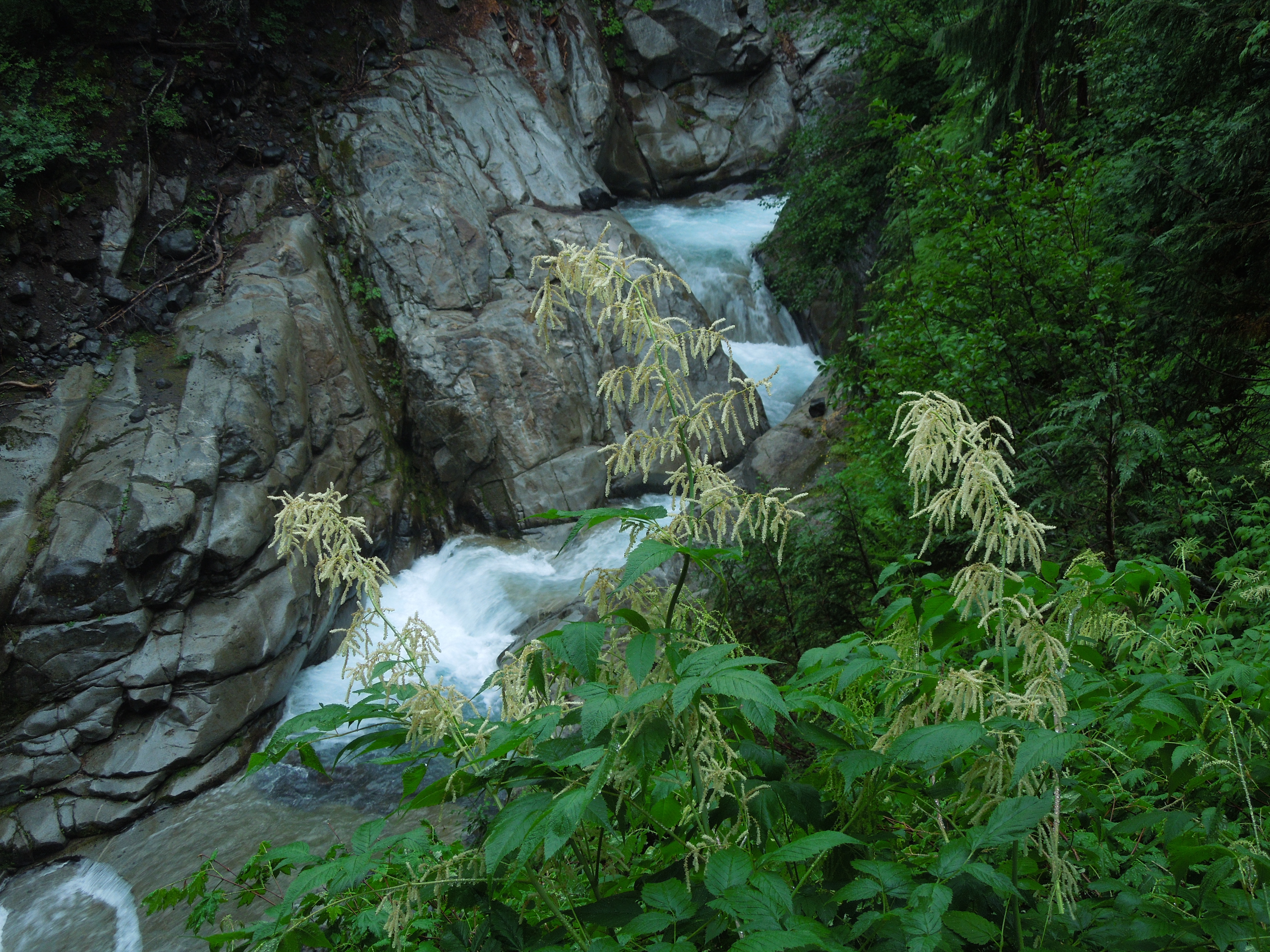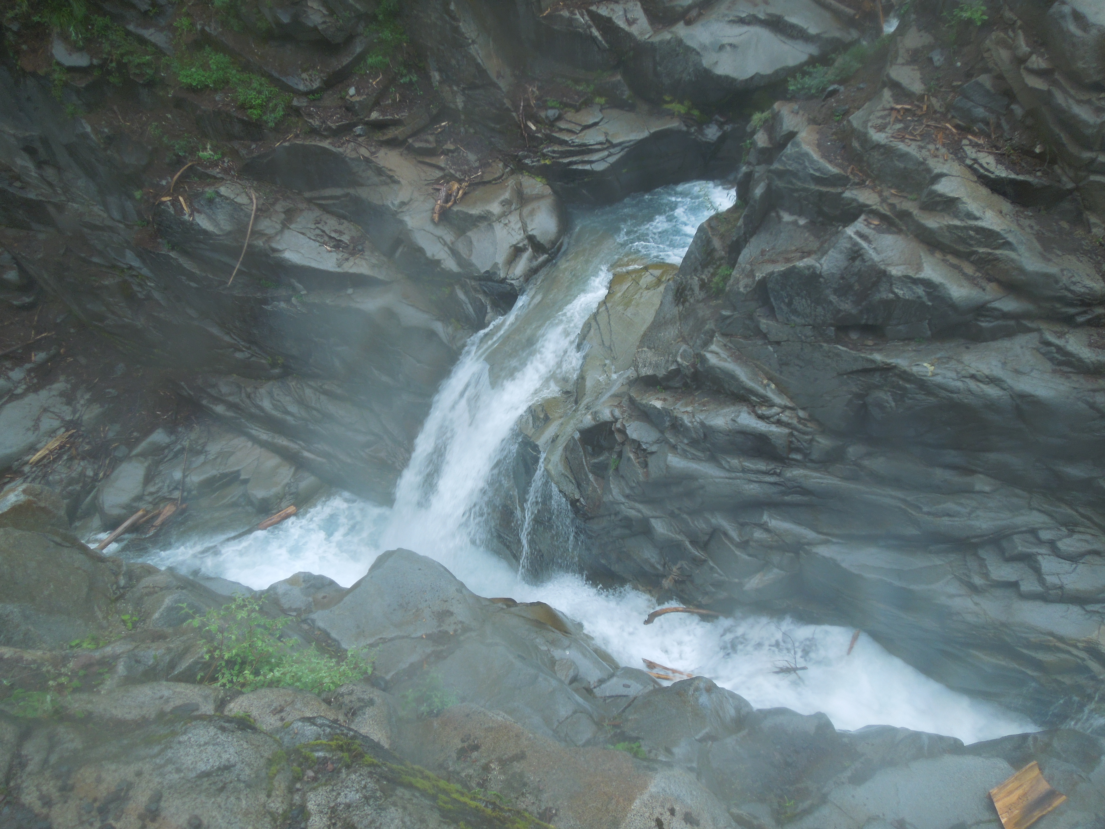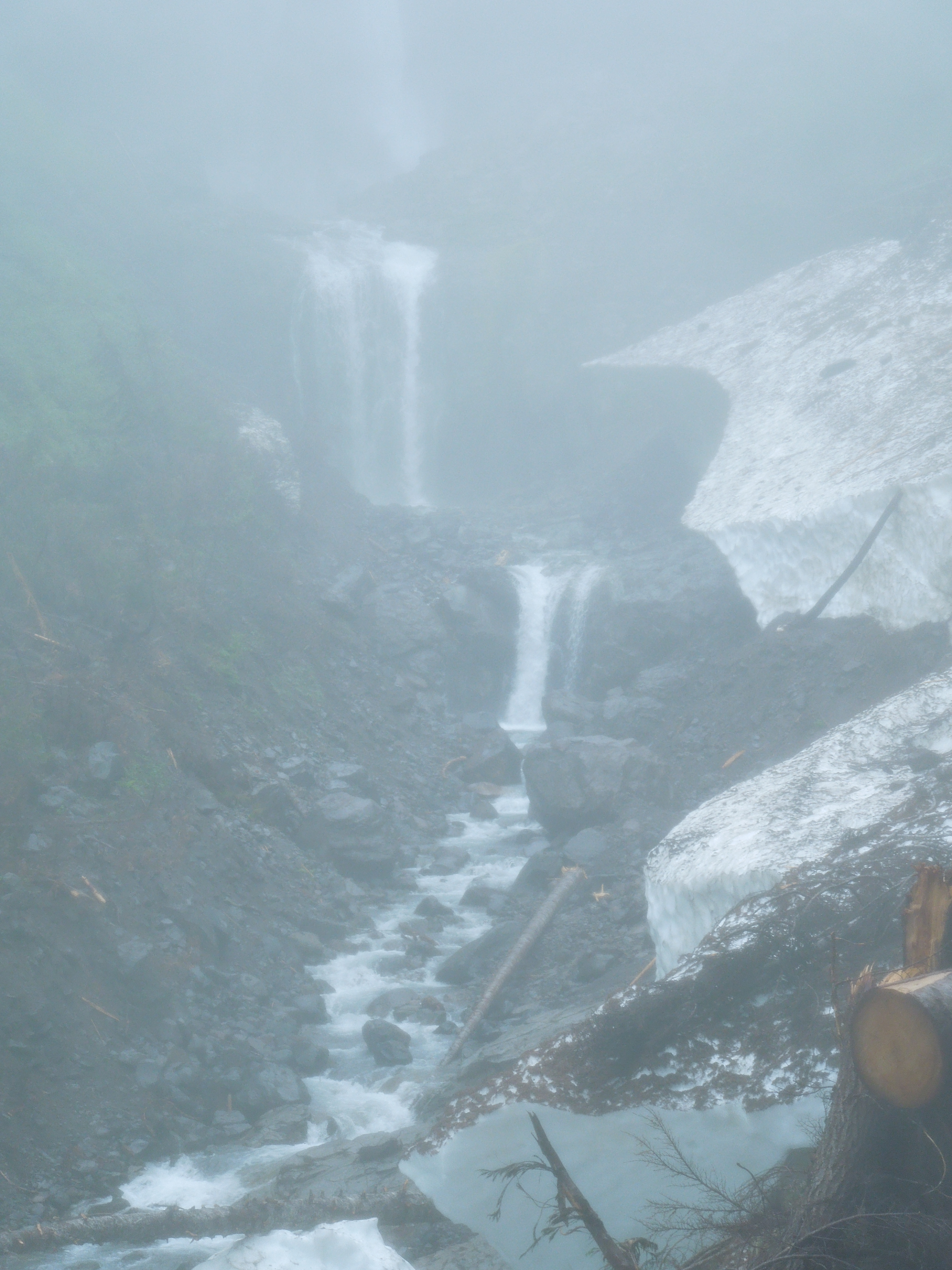 The weather and the temperature in the high 40’s were probably the only reasons we were able to find a parking space in the 14-spot lot at this usually very popular trailhead.DSCN2839 We headed up, following a few other brave souls, into the forest that didn’t protect us from the chill drizzle. Soon we crossed a wooden bridge above Christine Falls, and for the rest of the way up, thunderous flows of white, roiling water intermittently coursed below or beside us along the trail.