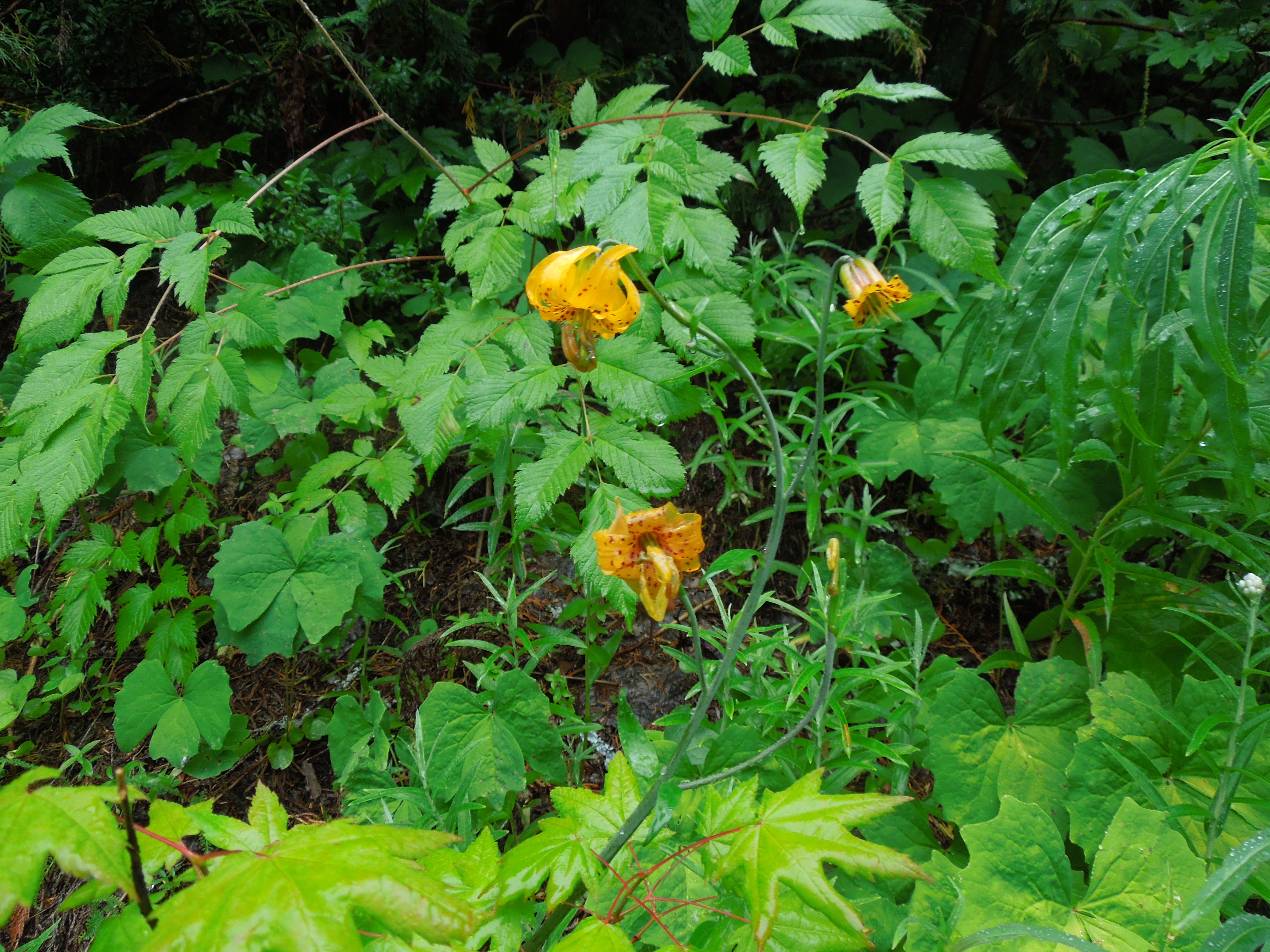 Climbing steadily through the woods, the trail was smooth at first and then became rougher with exposed tree roots and rocks, sometimes in stair steps and often slippery.DSCN2852DSCN2858 We saw many wildflowers, including two varieties – tall blue bonnet and the Wiggins lily – that we hadn’t seen anywhere else in the Park, and we saw them here only on one small segment of the trail.