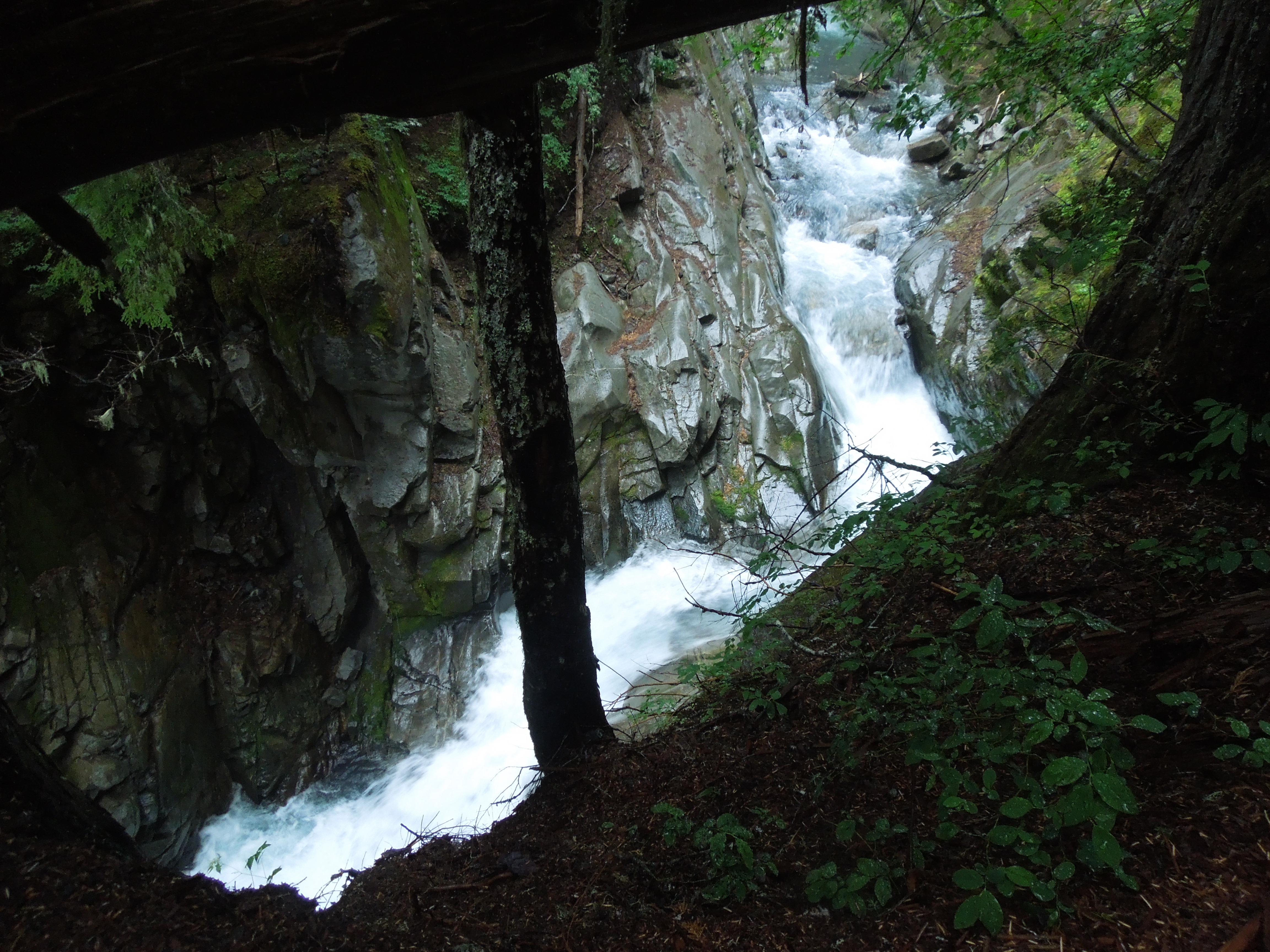 Just below Comet Falls, before we knew whether or not we’d have a view of it, we crossed a single log bridge over more audacious whitewater, crashing down from a side canyon.