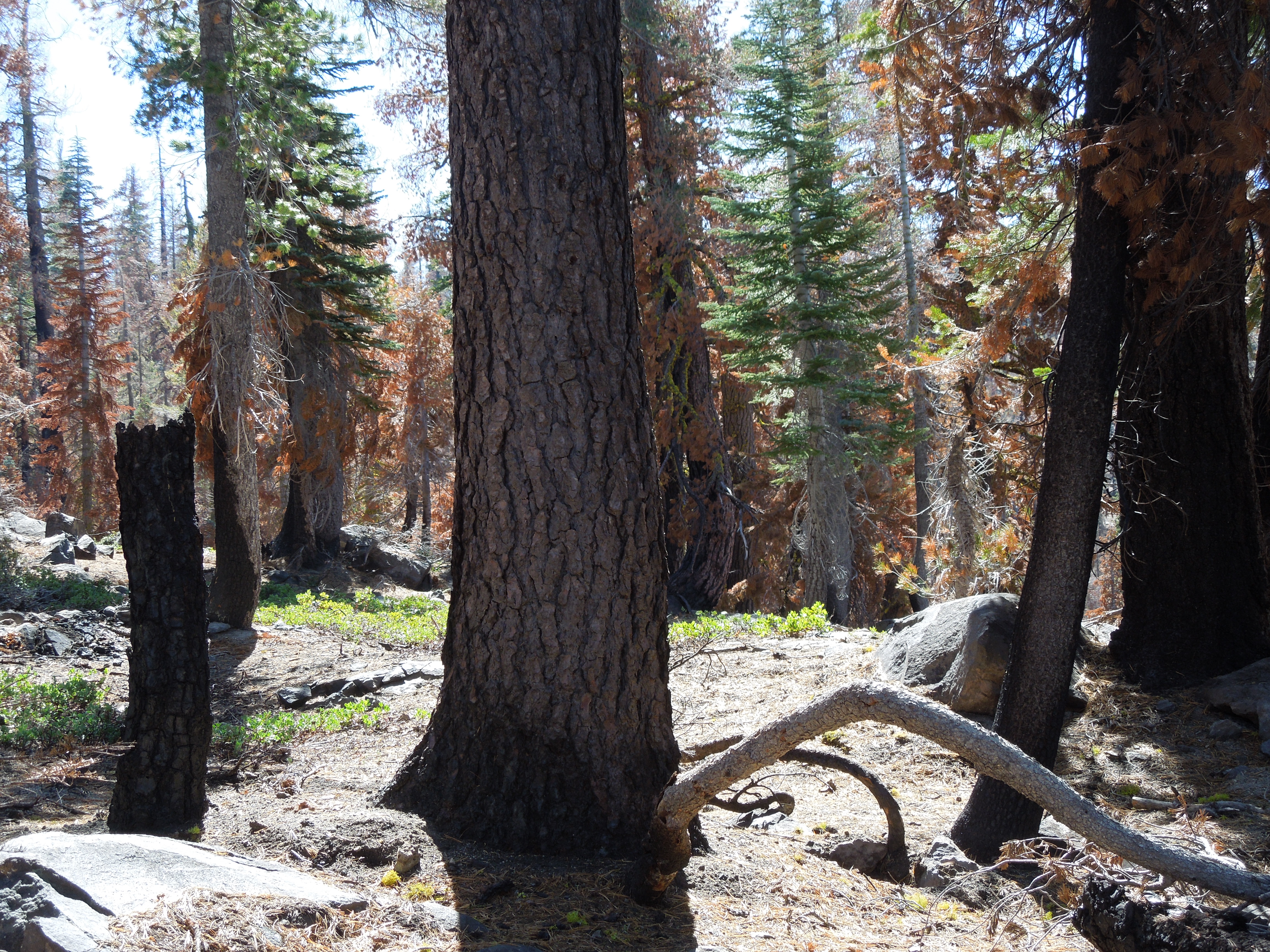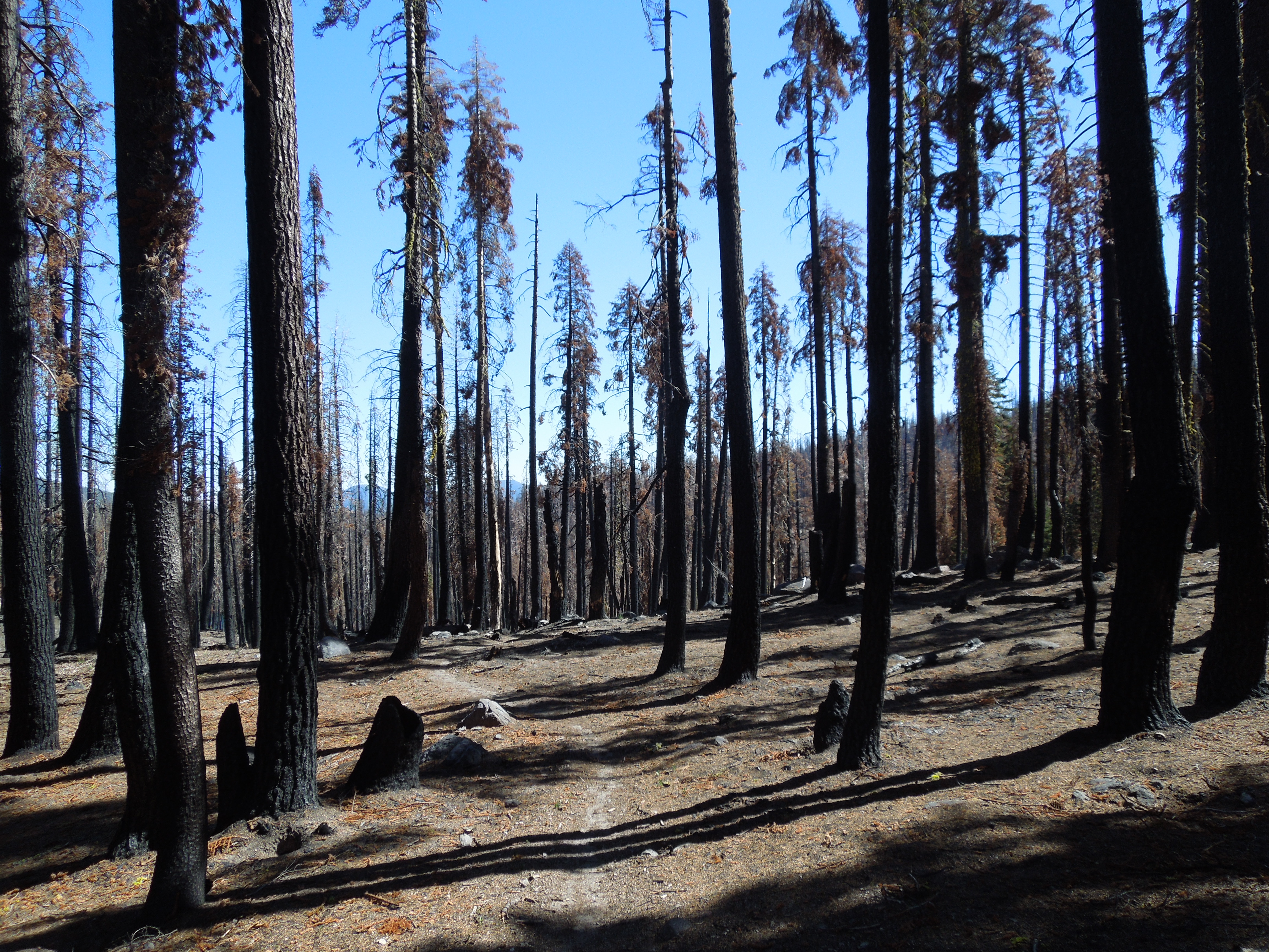 The first signs that we were entering a fire zone were a few evergreens with dead, orange-colored needles. Soon it became obvious that we had passed beyond the outer edges of the burn area.