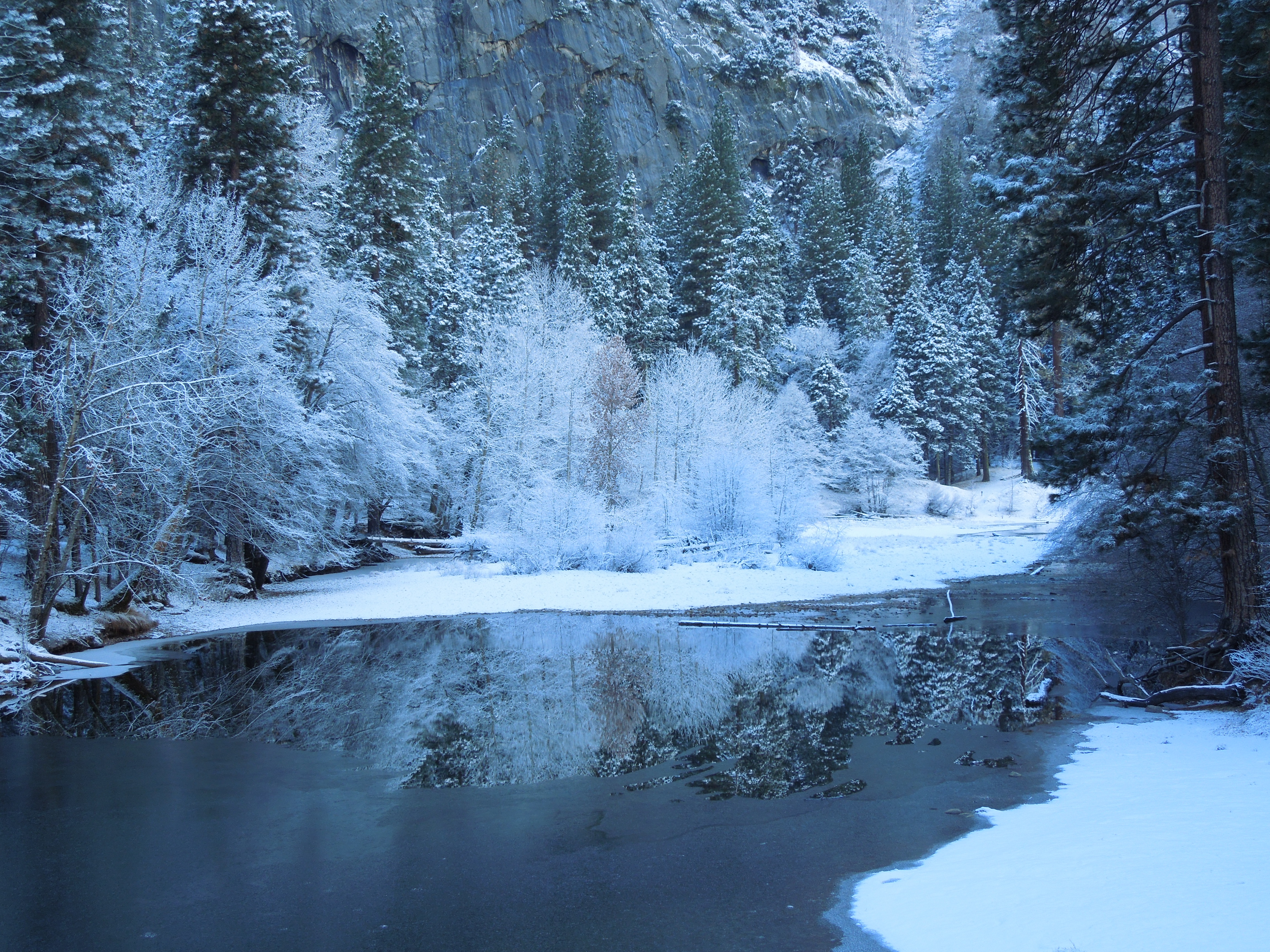 Last week we went to Yosemite for three days to partake of fine wines and food at one of the annual Vintners Holiday sessions at the Ahwahnee Hotel. Shortly before we arrived a snowstorm had dropped white fluff onto trees, meadows, and granite valley walls, turning the Park’s scenery into a winter postcard. Outside temperatures near freezing, or well below, and perfectly still air preserved the frosty conditions the whole time we were there.