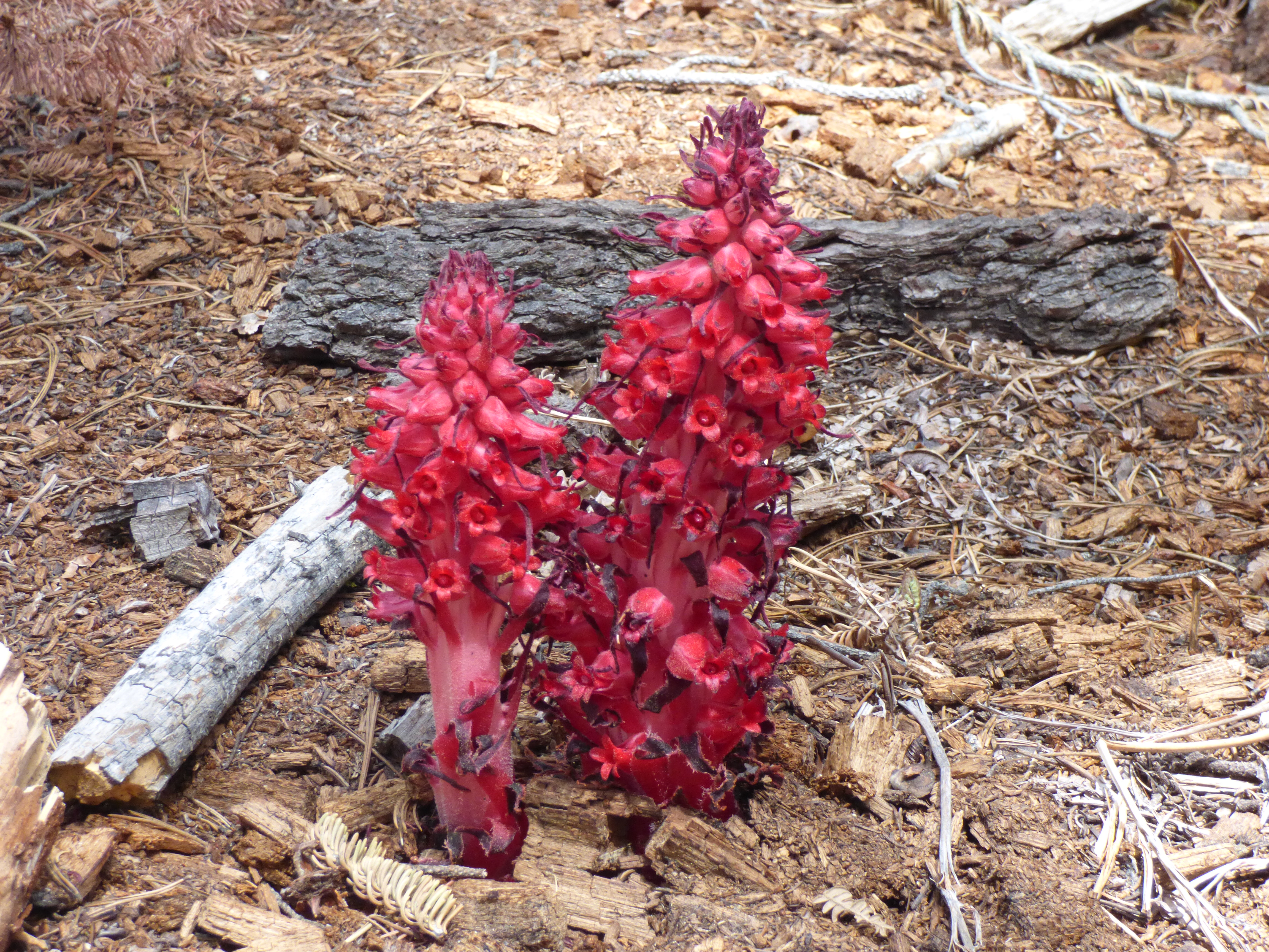 The trail trended downhill from its 8,100 foot starting elevation, not surprising since the top of North Dome is at 7,540 feet. We crossed a creek and saw the first of many red snow plants pushing up from the pine needles and detritus on the forest floor. They often come up through or near patches of mountain snow as it melts away into summer, but I haven’t seen any snow plants in years. They reminded me of childhood summers hiking in Lassen National Park.