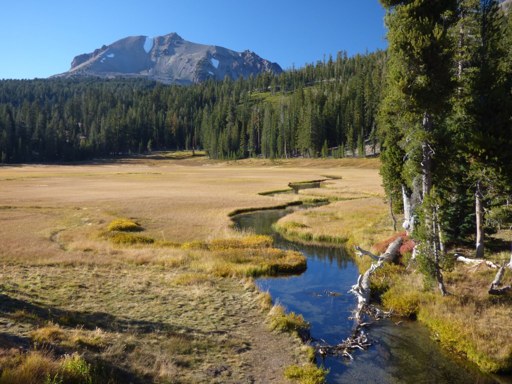 Lassen Peak rising above Kings Creek meandering through the golden-brown meadow