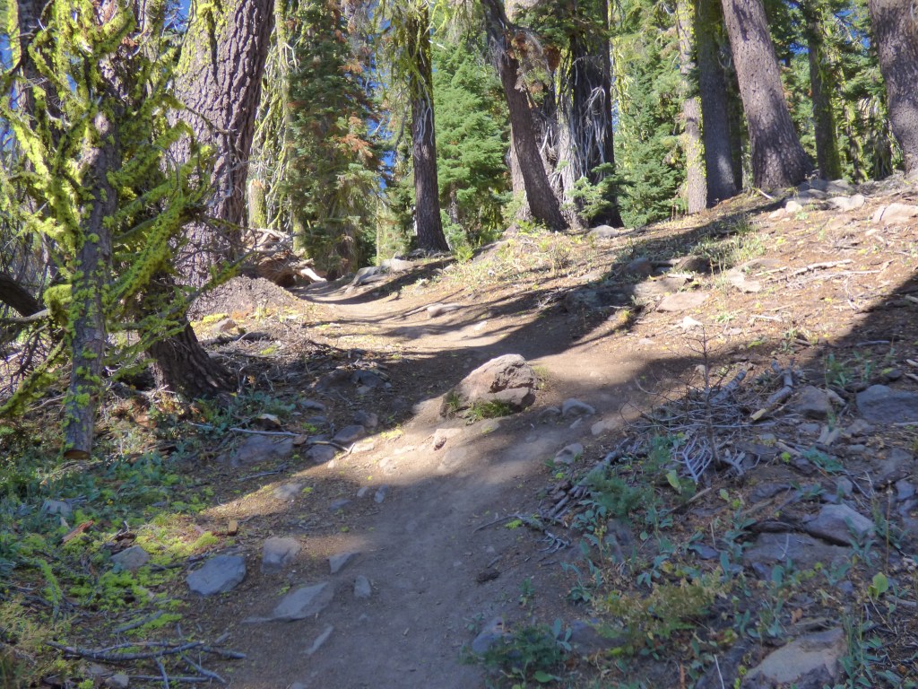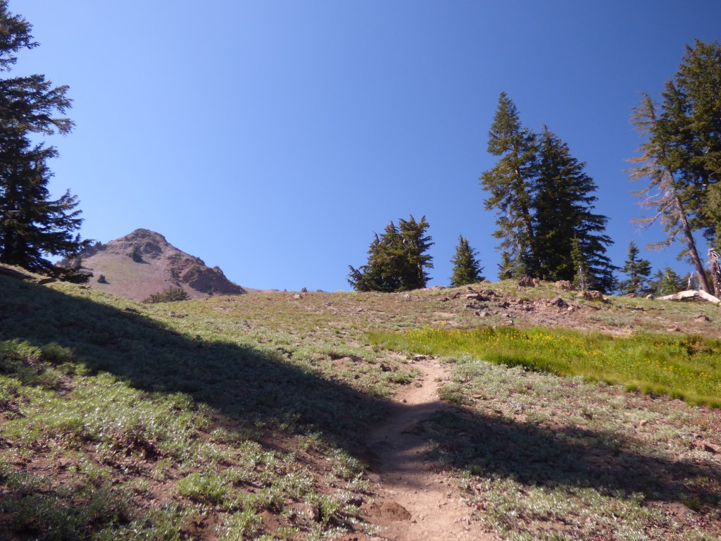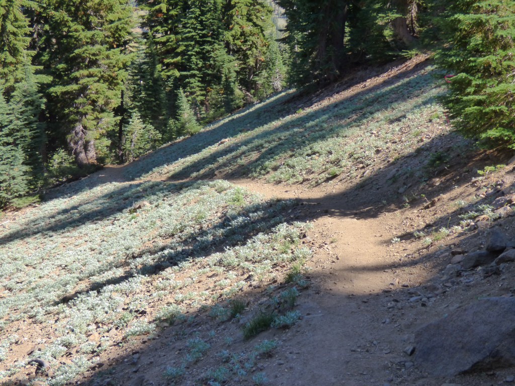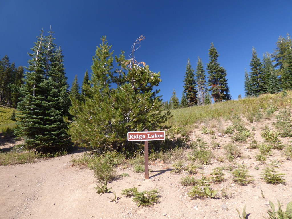 The trail to Ridge Lakes (or Lake, as it was the day of my visit because the water level was still high) starts steeply up the ridge from the parking lot for the Sulphur Works, not far from the Kohm Yah-mah-nee Visitor Center at the southwest entrance to the park. It is 1.1 miles long, but climbs steadily from just under 7,000 feet at the start to 8,000 feet at the lake, so it is rated a very difficult trail.